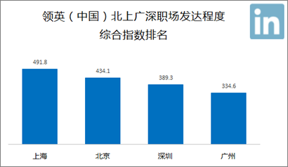 作為參考,領英在本次報告中也對北京、上海、廣州、深圳四個一線城市做了分析。在我們所列出來的五個評價指標中,上海分別在“職業社交用戶數量”、“職業社交活躍度”、“海外受教育比例”以及“職業檔案完整程度”四個指標中排名第一,當之無愧地成為中國職場發展程度最高的城市。