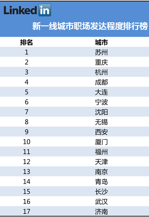 近日,有機構對國內排名靠前的新一線城市的幸福感程度進行排名和分級,衡量標準除了有京東、去哪兒、滴滴打車等消費、旅游、交通在內的生活類應用,還將領英(LinkedIn)作為各城市職場發展水平的重要衡量標準。為了完整反映國內新一線城市職場發展水平,領英對國內17座新一線城市的職場社交狀態做了深度的數據挖掘、分析與解讀,并發布了這份《中國新一線城市職場發達程度報告》。